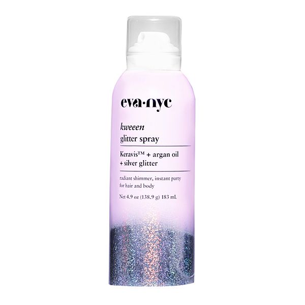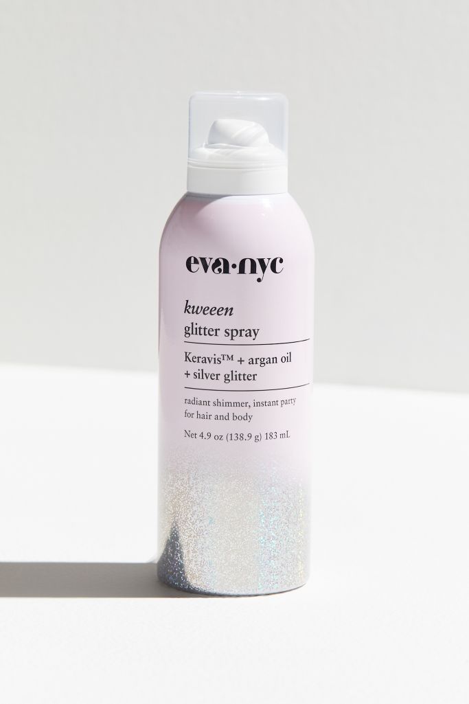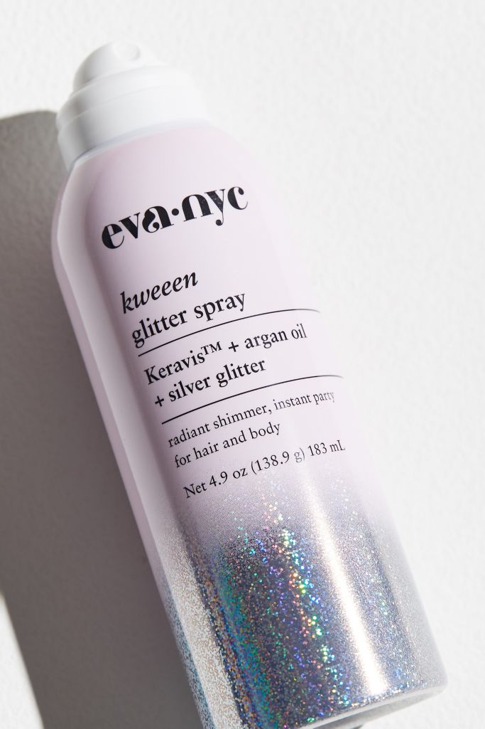 Hair is left shimmery sparkling and shiny Eva NYC kweeen glitter spray is a lightweight non-sticky formula that contains ultra-fine glitter particles that add a shimmery glow to your pre-party look. Shake well and hold 6 to 8 inches away from hair. Infused with Argan oil and Keravis Protein Complex this.