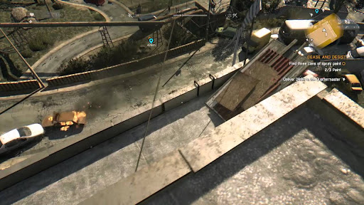 Dying Light - Find three cans of spray paint Go to the roof and use the paint to mark the choppers landind pad Talk to Erol Recover Erols duffle bag Get back to r r A little walkthrough of where the spray pain cans are. One is right near the foot of the ladder going down the building and the other is near the bottom of the scaffolding. Go back to the School and reach the roof for example by jumping onto the balcony over the main entrance and using the ladder.