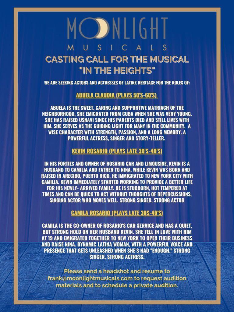 The online musical for one of my fav musicals. The Grant Wilfley casting agency will hold a casting call for extras in Washington Heights on June 1 at West 187th Street and Wadsworth Avenue the agency recently announced. In the Heights performance dates are August 7. The film will be directed by Jon M. San Antonio Broadway Theatres productions involve a short and. You will receive the latest news and updates on your favorite celebrities. Edinburgh based youth company A-Team Productions has announced an open casting call for its February 2018 production of Lin-Manuel Mirandas award-winning musical In The Heights.